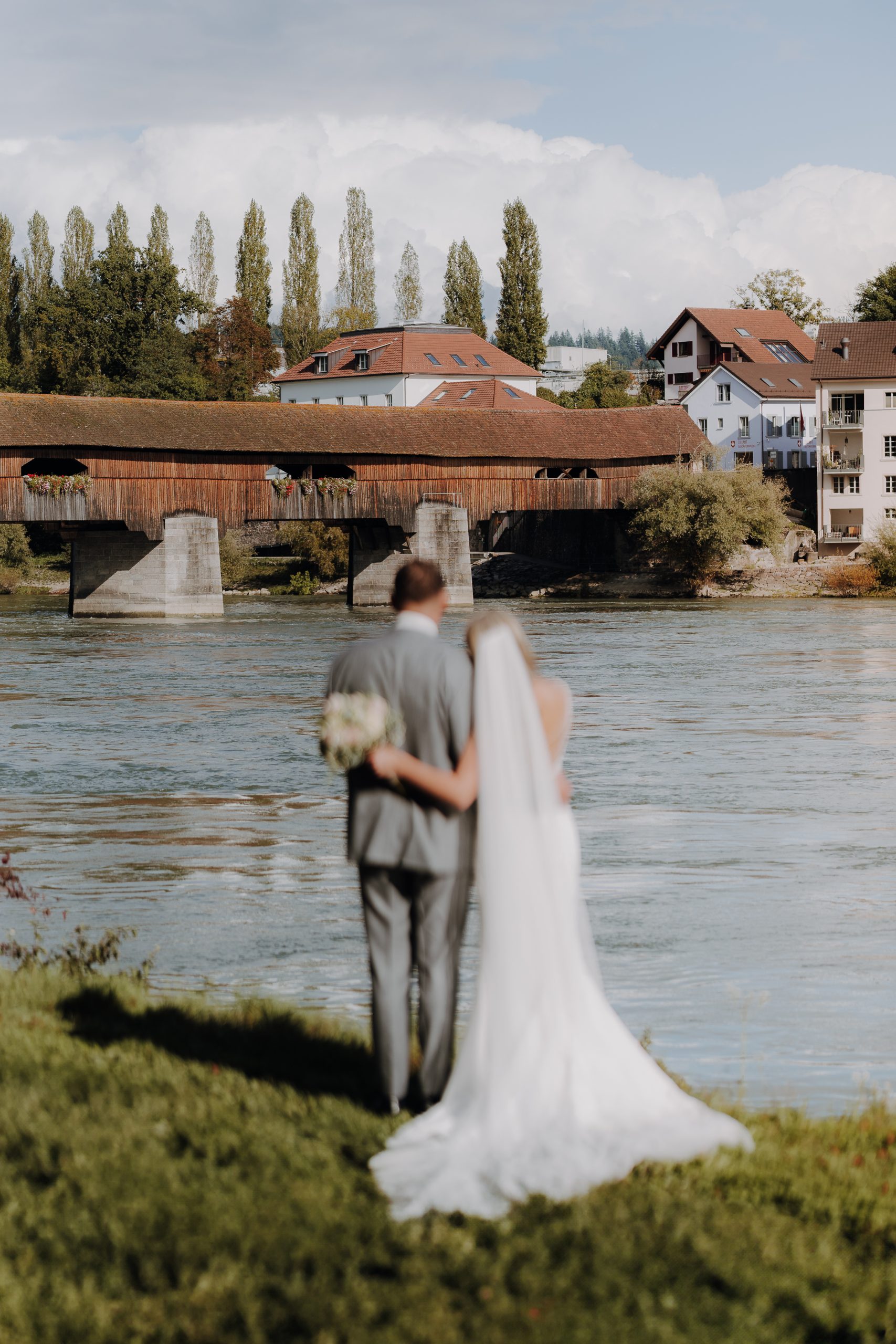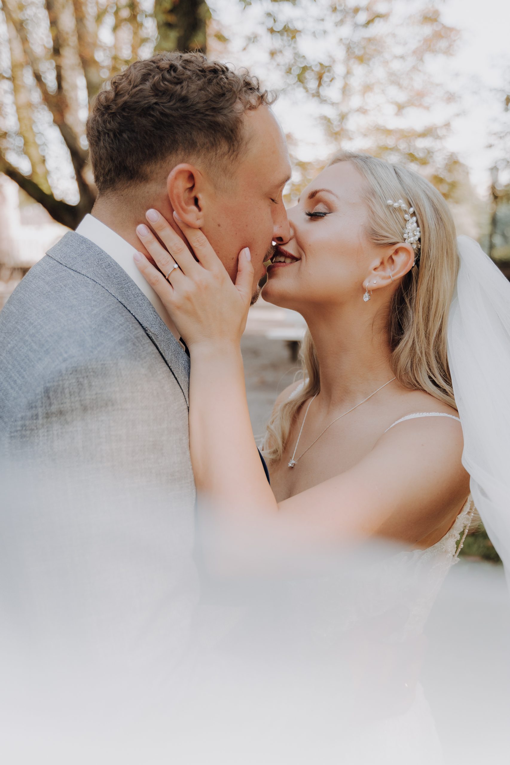 Die Braut schaut dem Bräutigam verliebt in die Augen